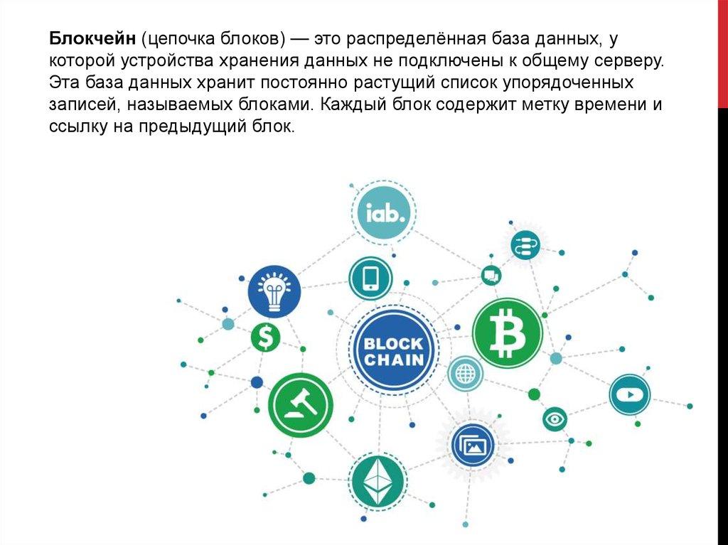 Блокчейн (цепочка блоков) — это распределённая база данных, укоторой устройства хранения данных не подключены к общему серверу.