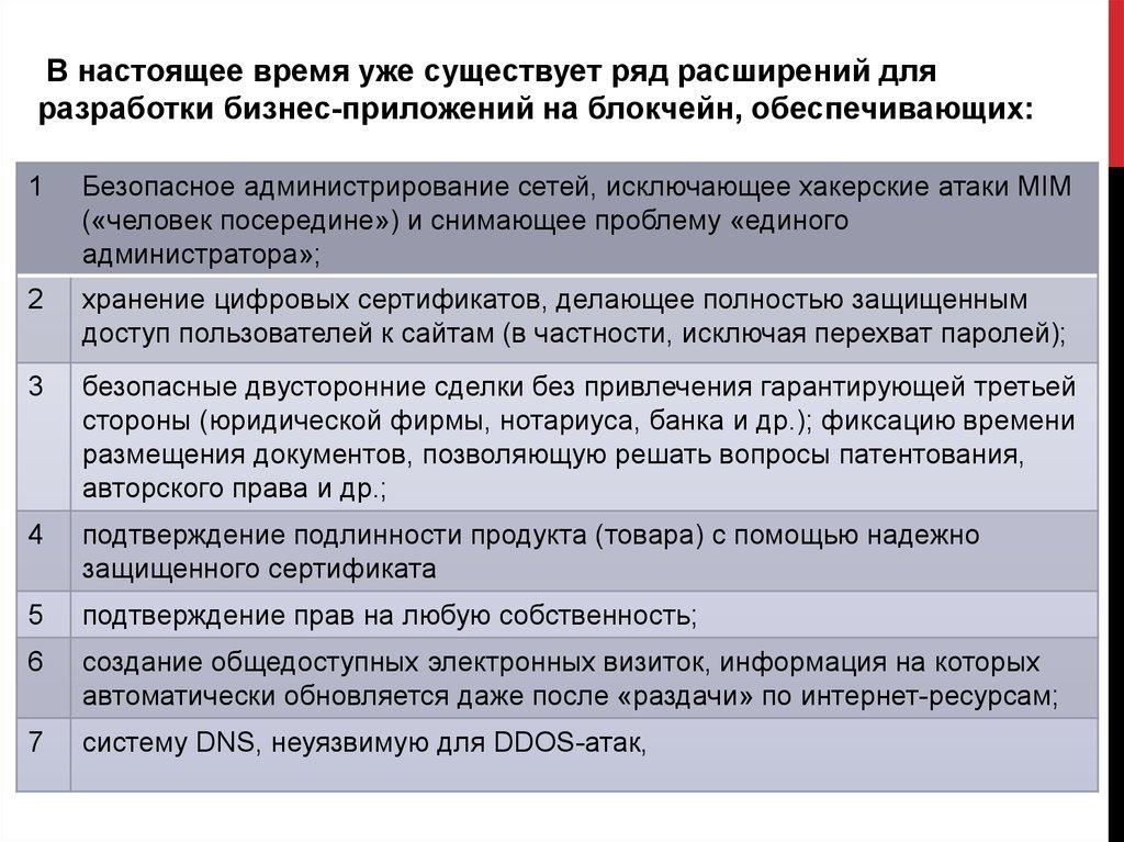 В настоящее время уже существует ряд расширений дляразработки бизнес-приложений на блокчейн, обеспечивающих: