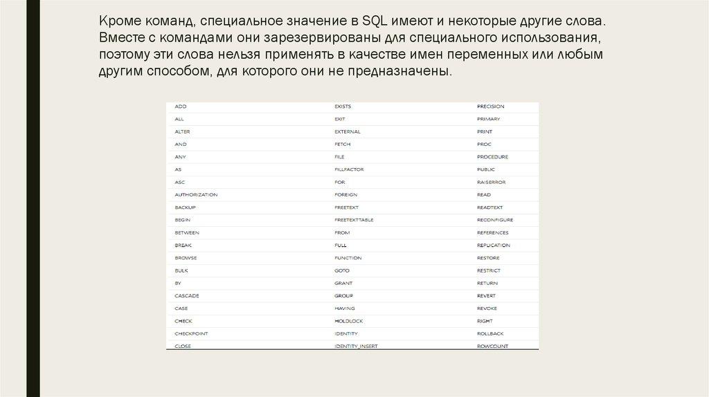 Кроме команд, специальное значение в SQL имеют и некоторые другие слова.Вместе с командами они зарезервированы для специального использования,
