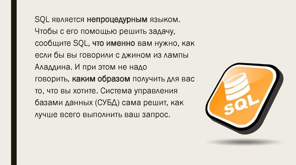 SQL является непроцедурным языком.Чтобы с его помощью решить задачу,