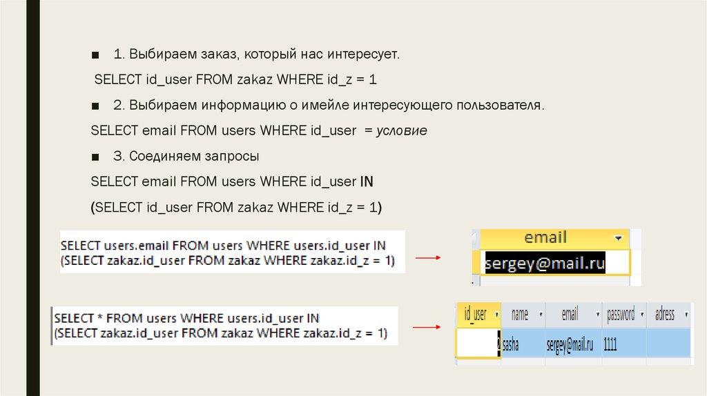 ■ 1. Выбираем заказ, который нас интересует.SELECT id_user FROM zakaz WHERE id_z = 1