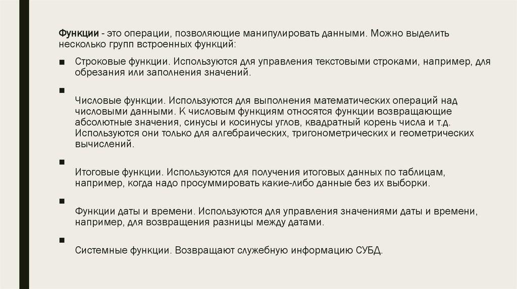 Функции - это операции, позволяющие манипулировать данными. Можно выделитьнесколько групп встроенных функций: