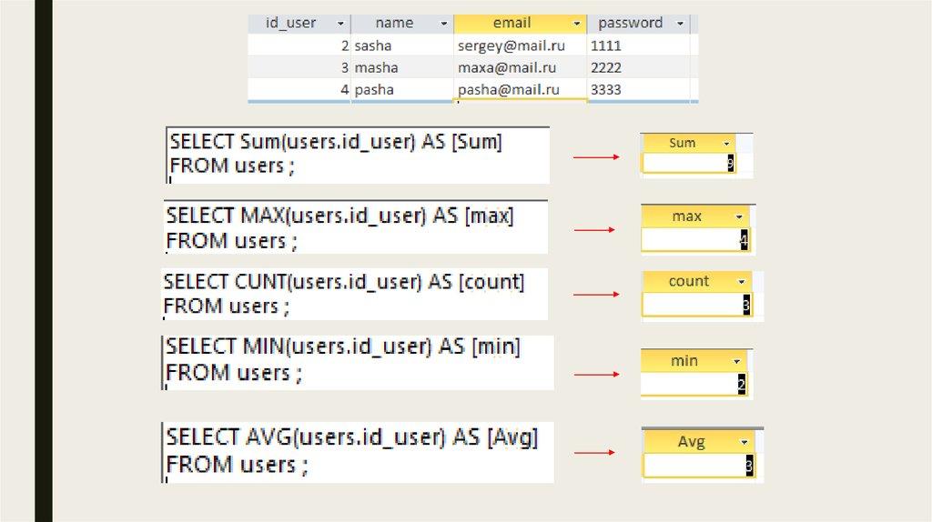 ■ AVG() Функция возвращает среднее значение столбца.■ COUNT() Функция возвращает число строк в столбце.