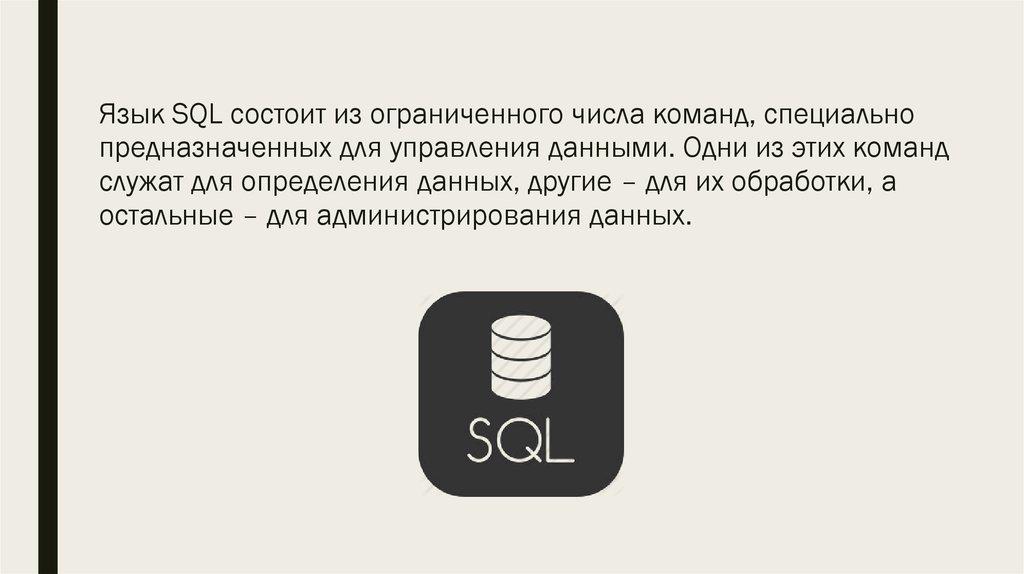 Язык SQL состоит из ограниченного числа команд, специальнопредназначенных для управления данными. Одни из этих команд