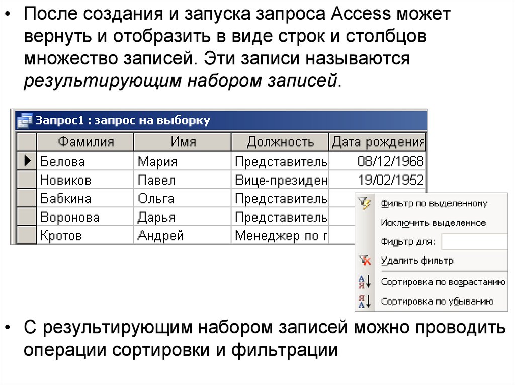 • После создания и запуска запроса Access можетвернуть и отобразить в виде строк и столбцов