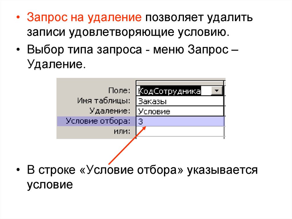 • Запрос на удаление позволяет удалитьзаписи удовлетворяющие условию.