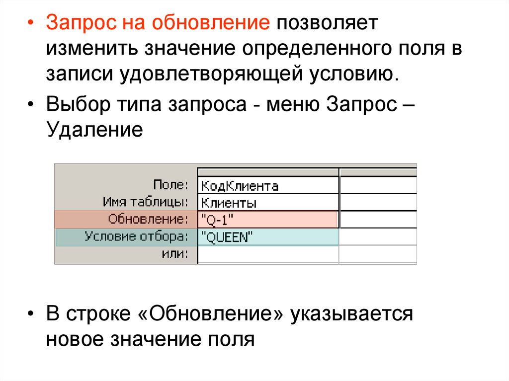 • Запрос на обновление позволяетизменить значение определенного поля в