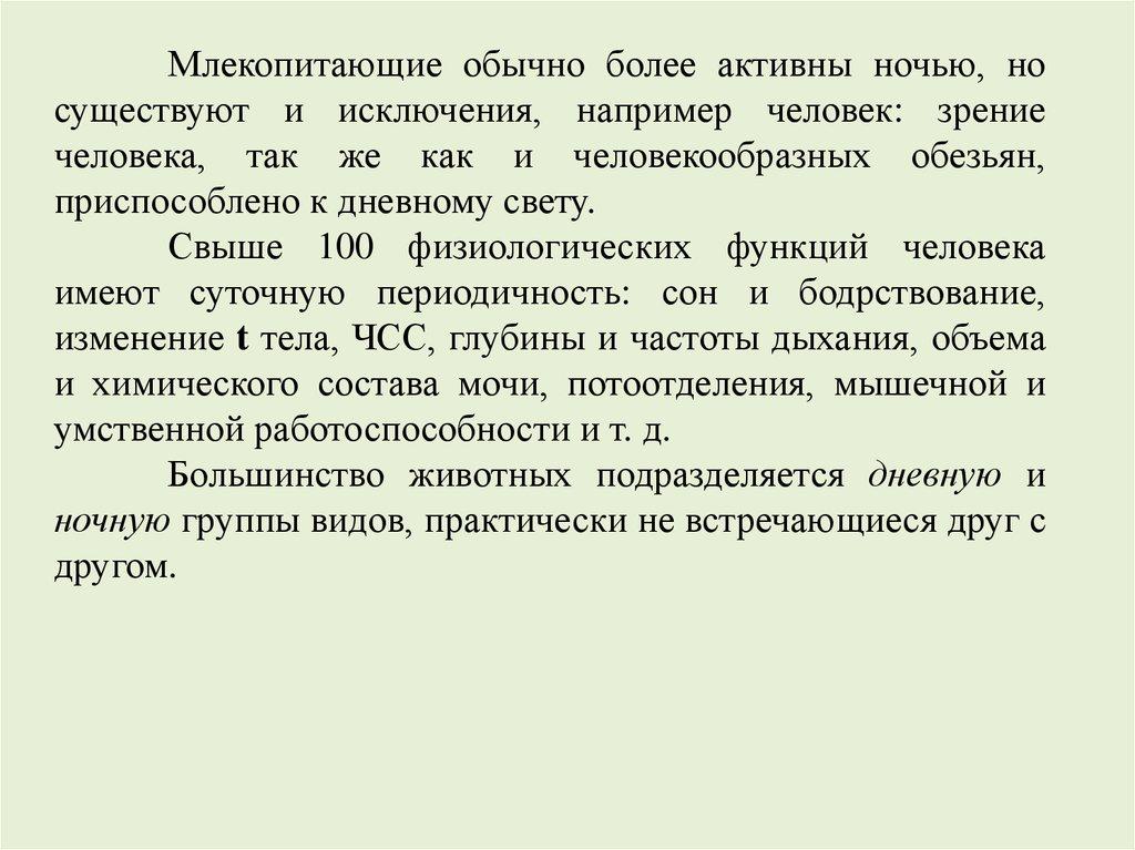 Млекопитающие обычно более активны ночью, носуществуют и исключения, например человек: зрение