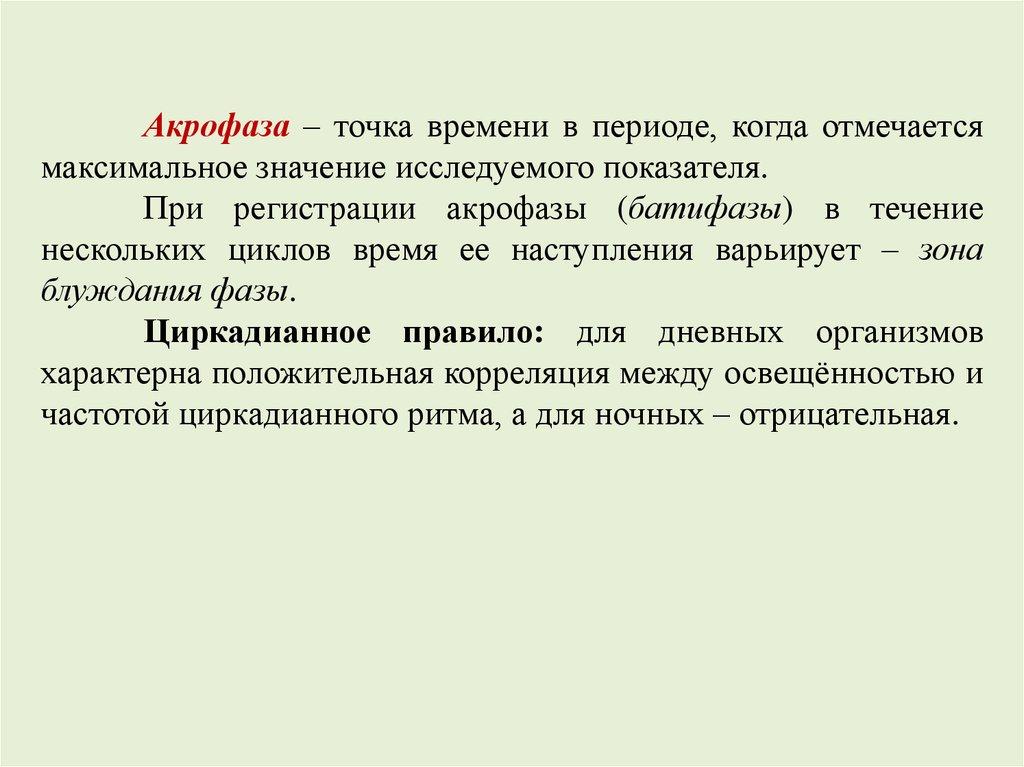 Акрофаза – точка времени в периоде, когда отмечаетсямаксимальное значение исследуемого показателя.