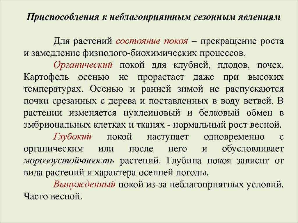 Приспособления к неблагоприятным сезонным явлениямДля растений состояние покоя – прекращение роста