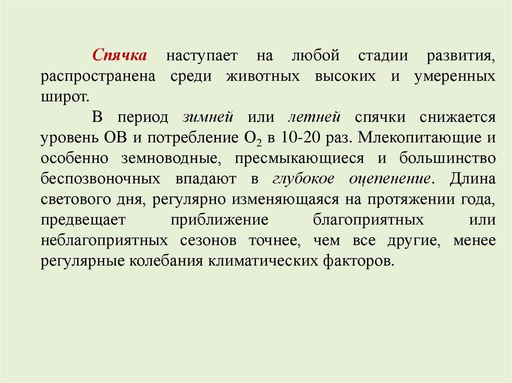 Спячка наступает на любой стадии развития,распространена среди животных высоких и умеренных