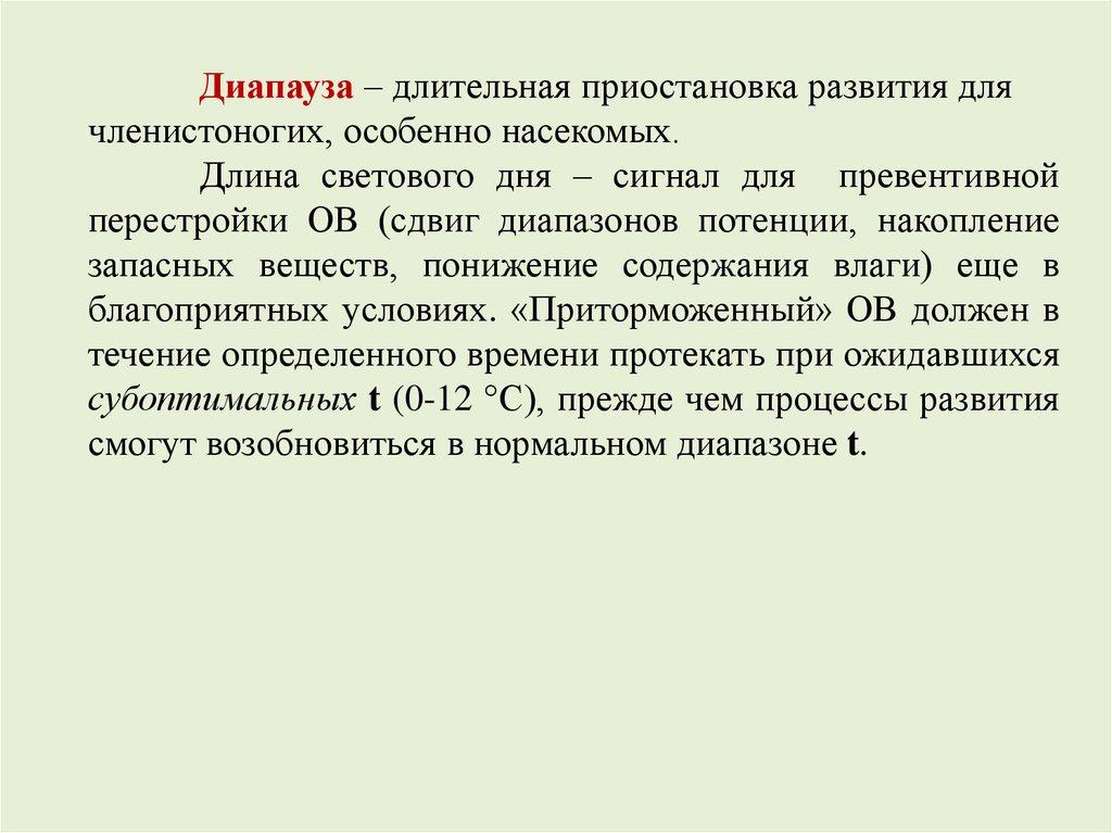 Диапауза – длительная приостановка развития длячленистоногих, особенно насекомых.