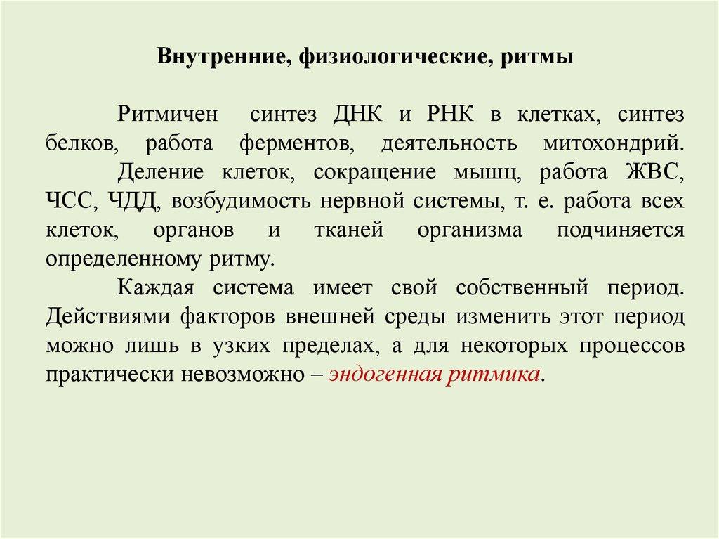 Внутренние, физиологические, ритмыРитмичен синтез ДНК и РНК в клетках, синтез