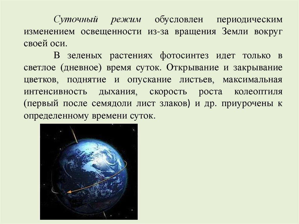 Суточный режим обусловлен периодическимизменением освещенности из-за вращения Земли вокруг