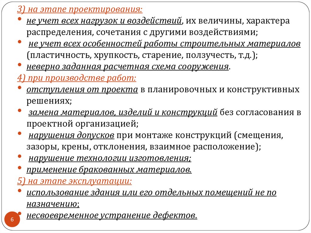 • не учет всех нагрузок и воздействий, их величины, характера