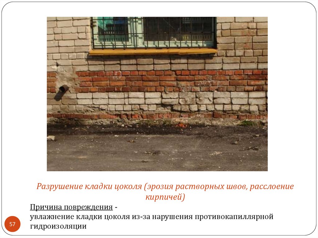 Разрушение кладки цоколя (эрозия растворных швов, расслоениекирпичей)