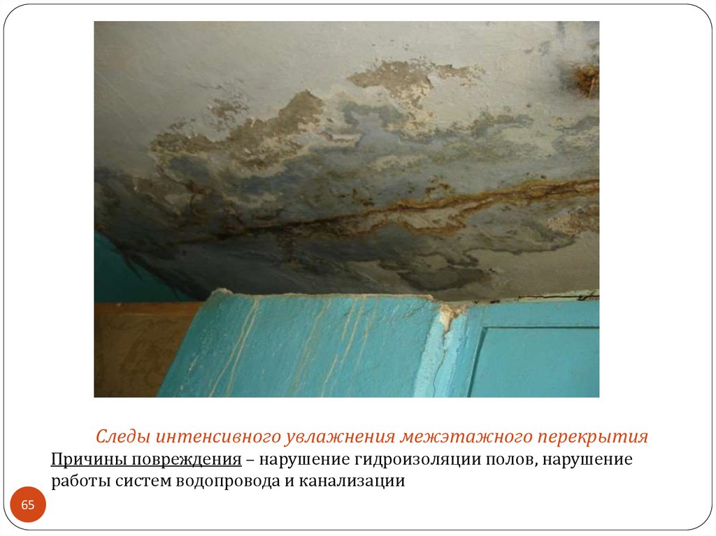 Следы интенсивного увлажнения межэтажного перекрытияПричины повреждения – нарушение гидроизоляции полов, нарушение