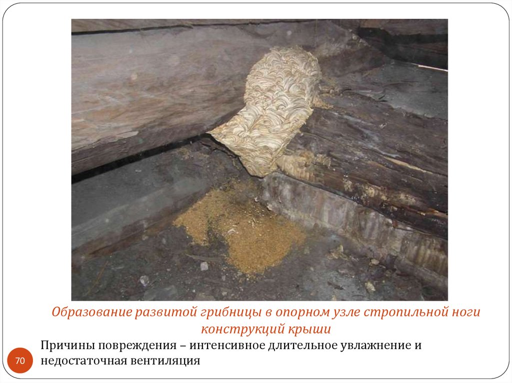 Образование развитой грибницы в опорном узле стропильной ногиконструкций крыши