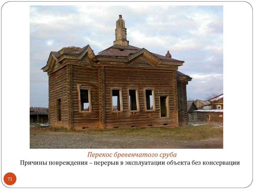 Перекос бревенчатого срубаПричины повреждения – перерыв в эксплуатации объекта без консервации