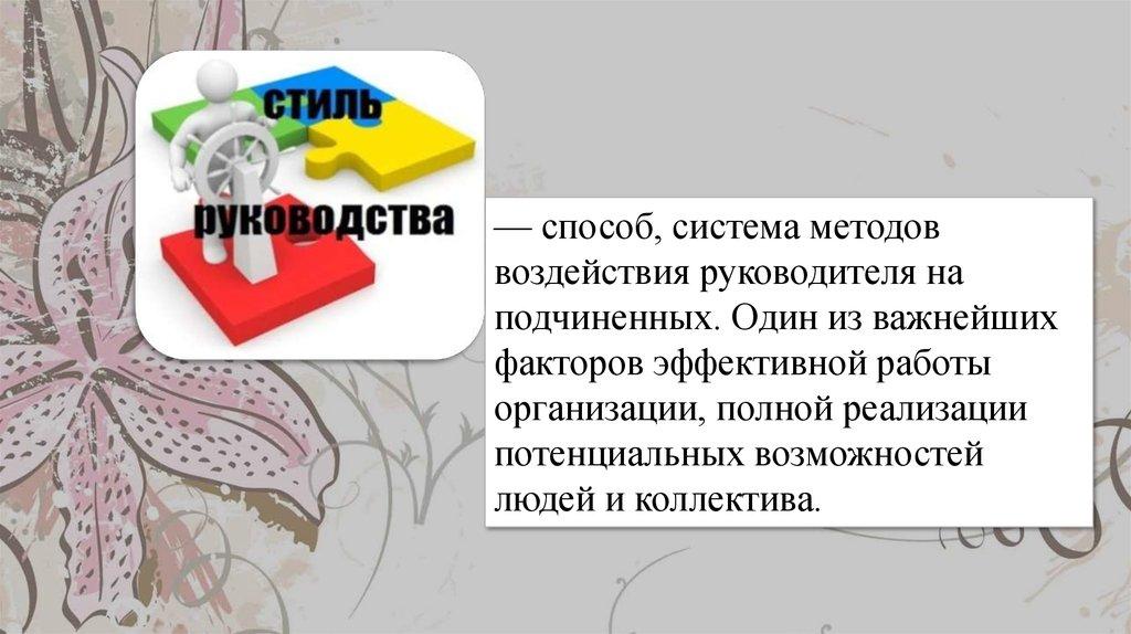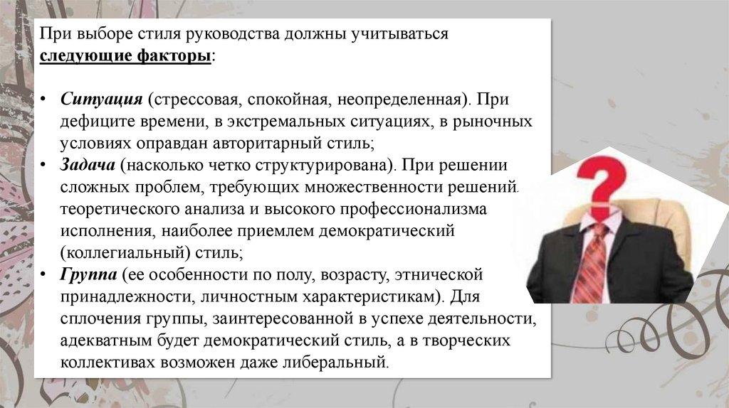 При выборе стиля руководства должны учитыватьсяследующие факторы: