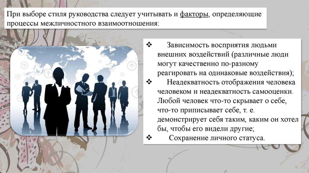 При выборе стиля руководства следует учитывать и факторы, определяющиепроцессы межличностного взаимоотношения: