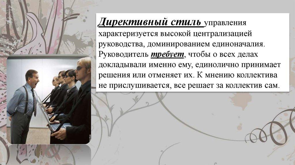 Директивный стиль управленияхарактеризуется высокой централизацией