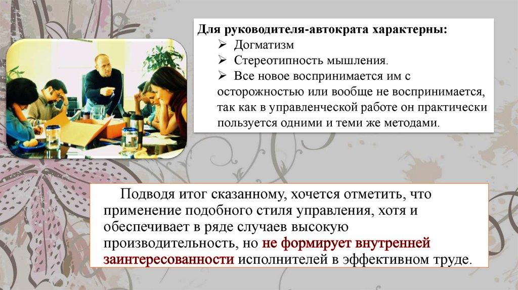 Преобладающими методами управления являютсяприказы, наказания, замечания, выговоры, лишение