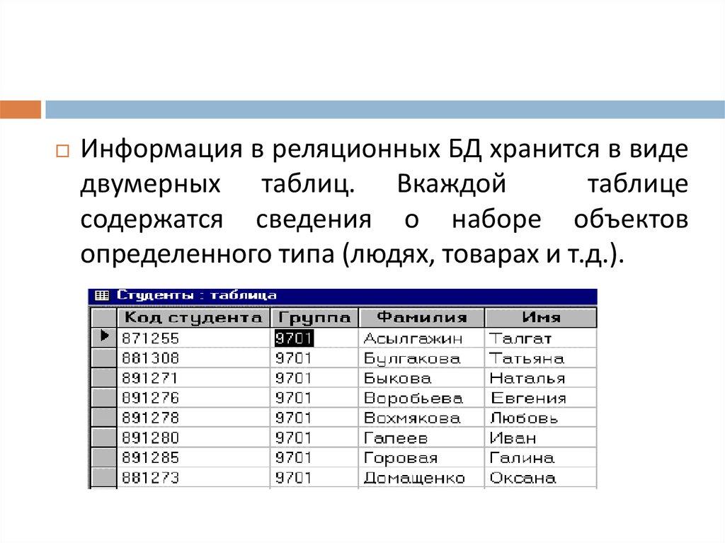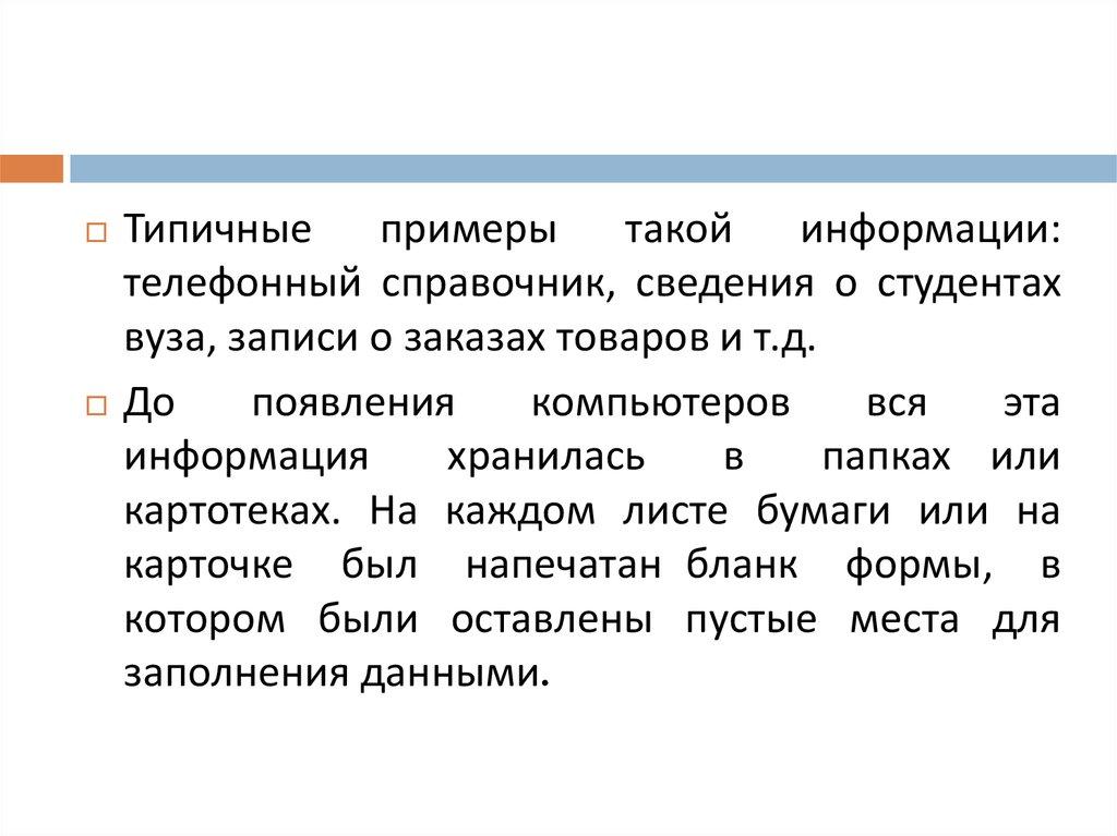 Типичные примеры такой информации:телефонный справочник, сведения о студентах
