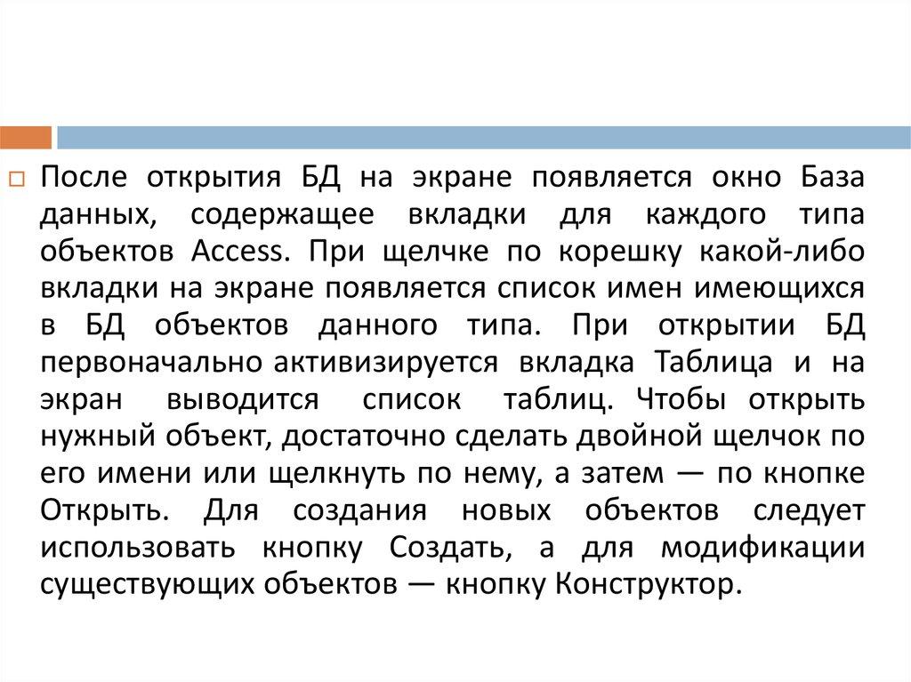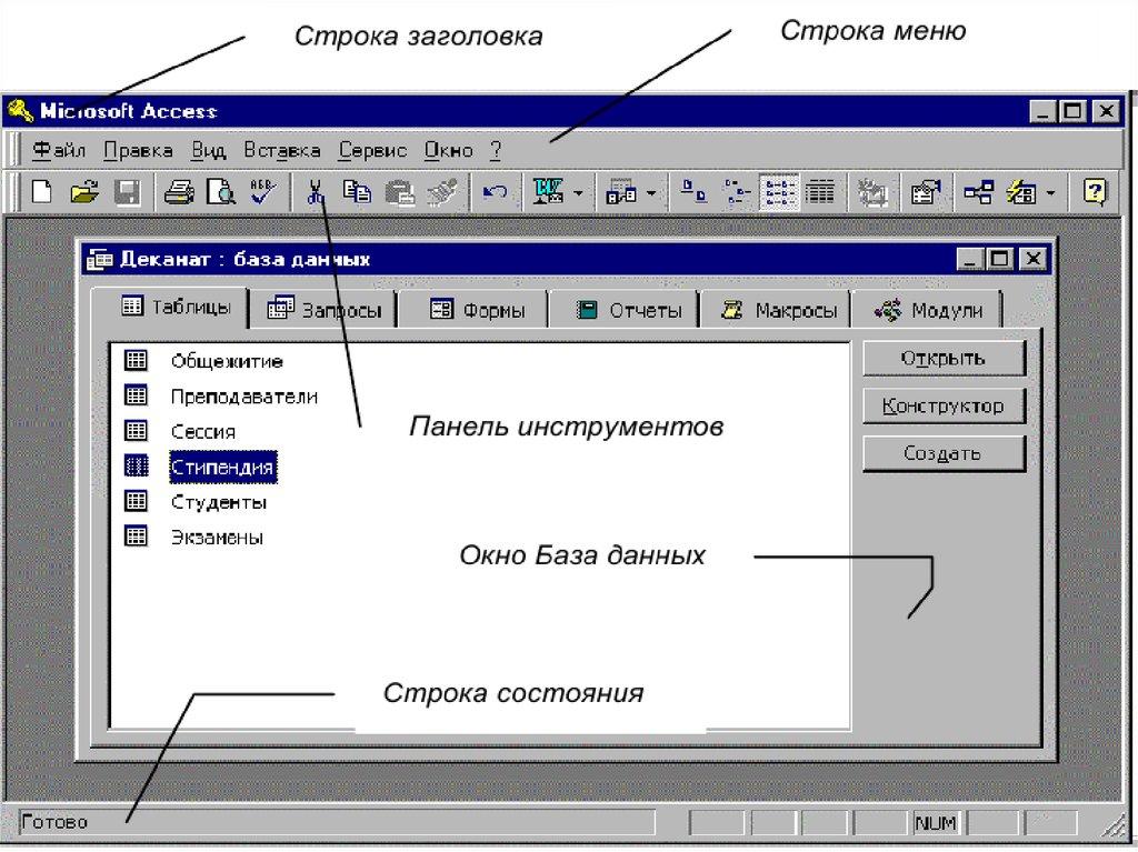 После открытия БД на экране появляется окно Базаданных, содержащее вкладки для каждого типа