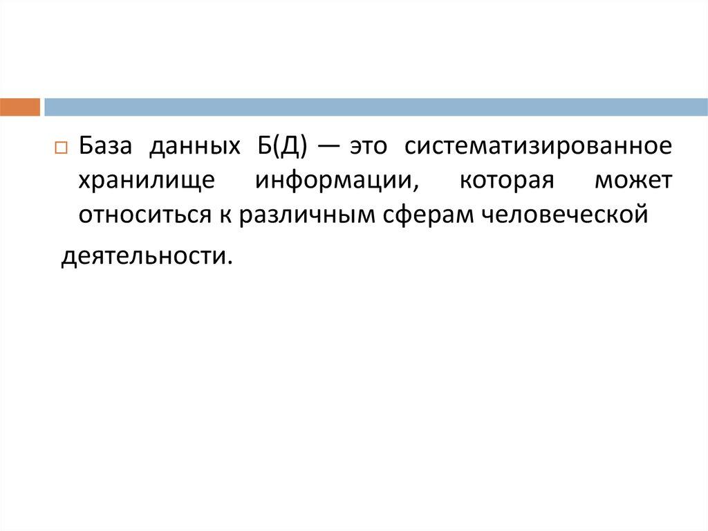 База данных Б(Д) — это систематизированноехранилище информации, которая может
