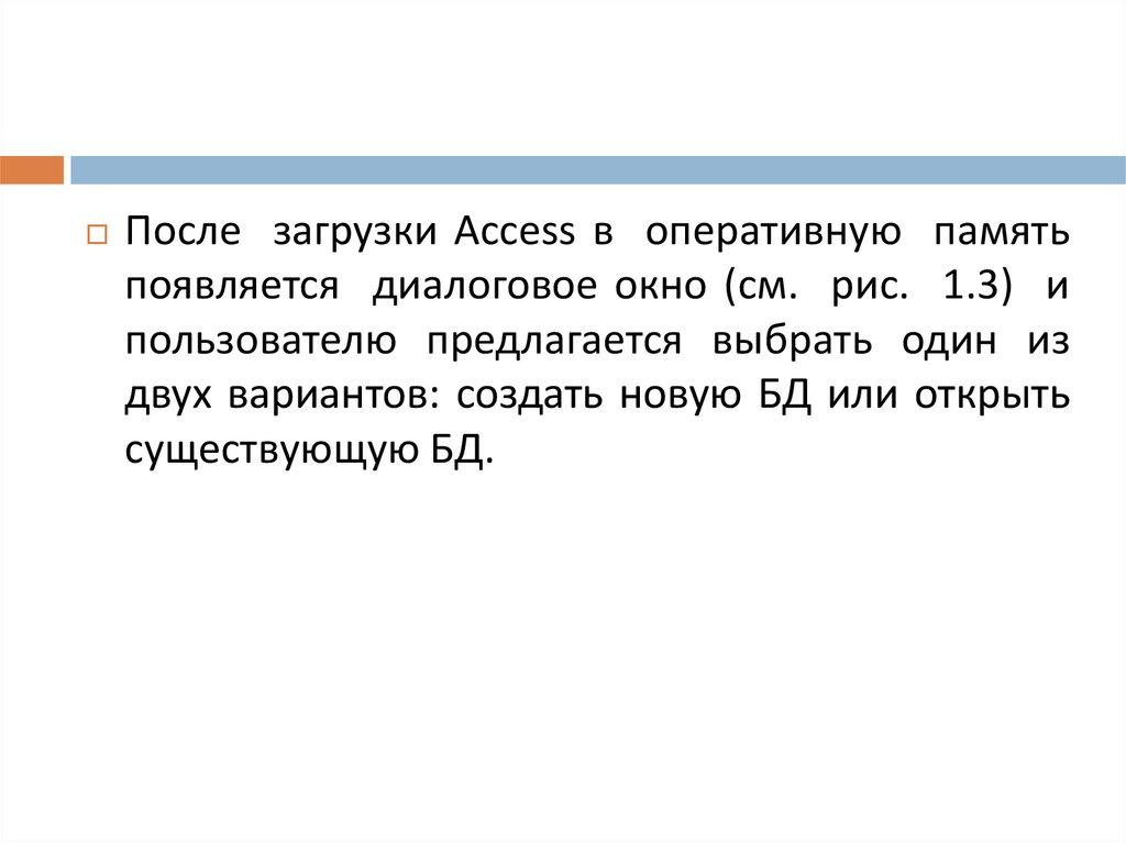 После загрузки Access в оперативную памятьпоявляется диалоговое окно (см. рис. 1.3) и