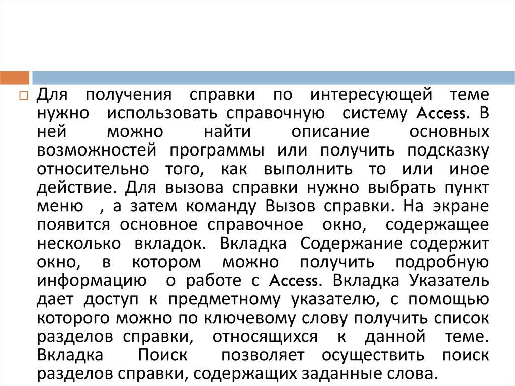 Для получения справки по интересующей теменужно использовать справочную систему Access. В
