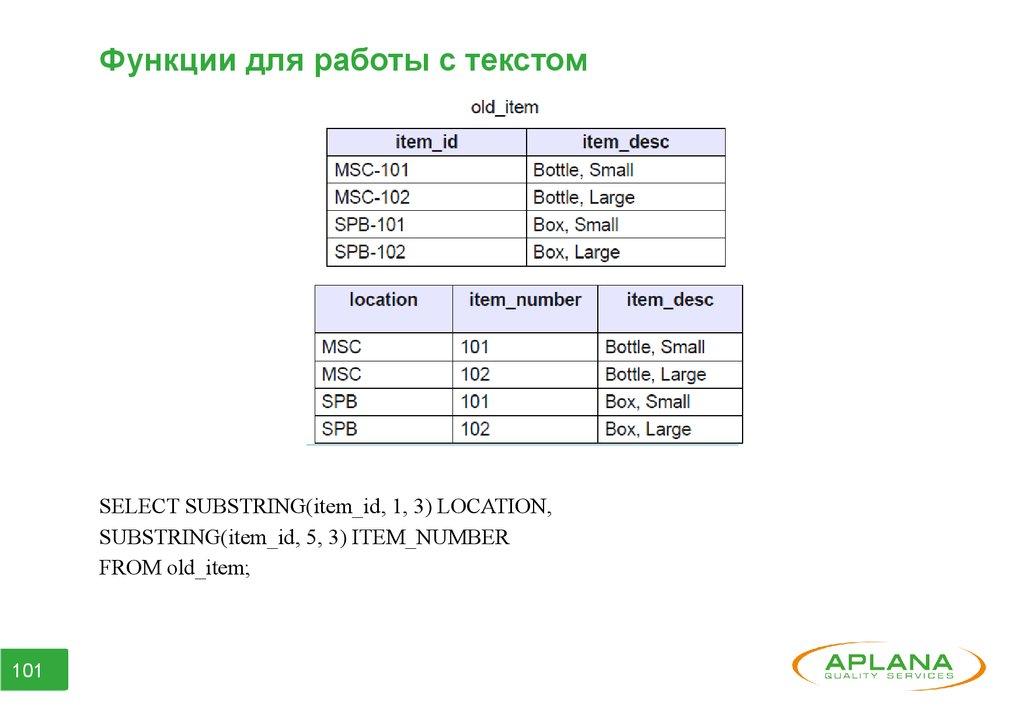 Функции для работы с текстомSELECT SUBSTRING(item_id, 1, 3) LOCATION,