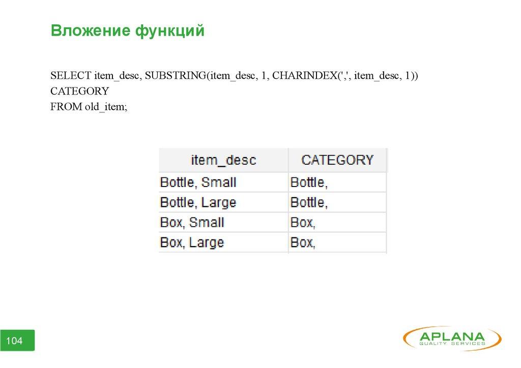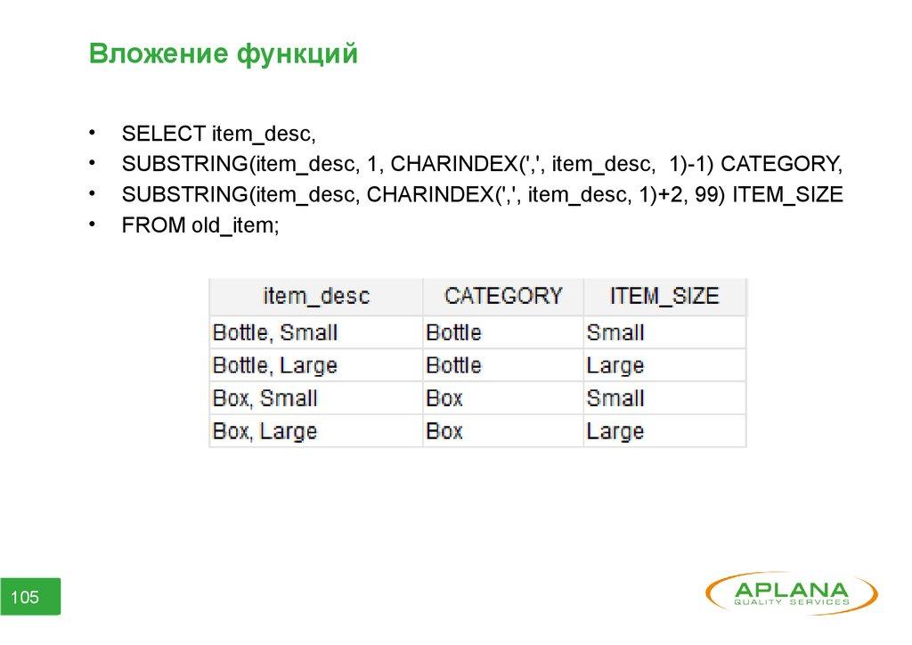 Вложение функцийSELECT item_desc, SUBSTRING(item_desc, 1, CHARINDEX(',', item_desc, 1))