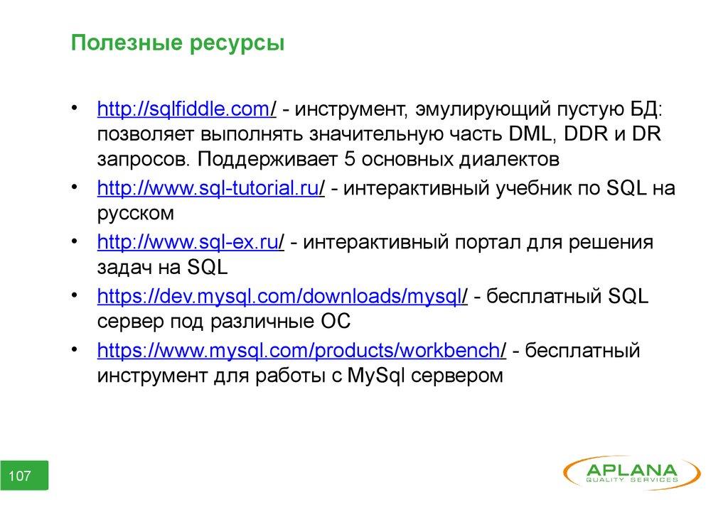 Полезные ресурсы• http://sqlfiddle.com/ - инструмент, эмулирующий пустую БД: