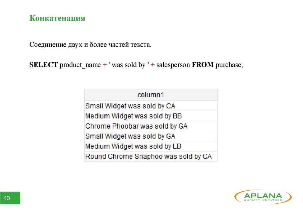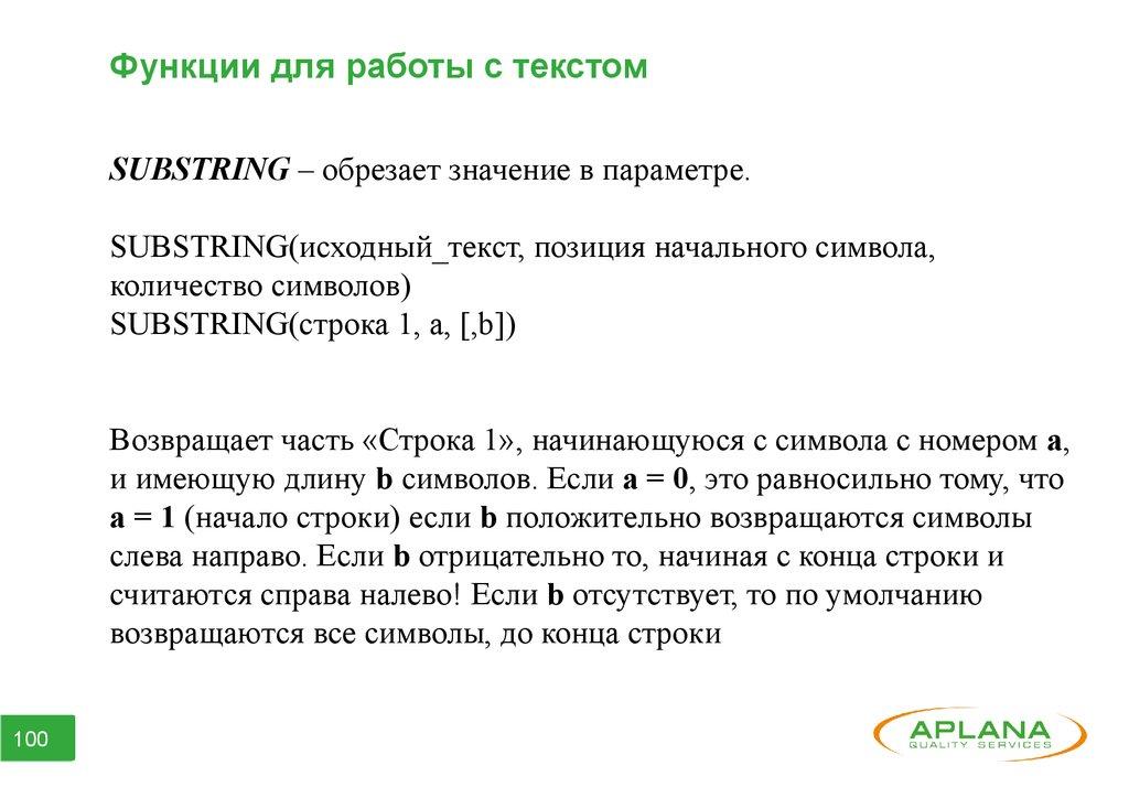 Функции для работы с текстомSUBSTRING – обрезает значение в параметре.
