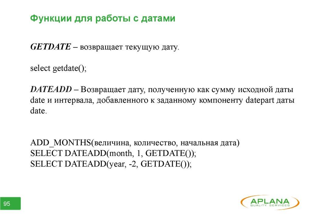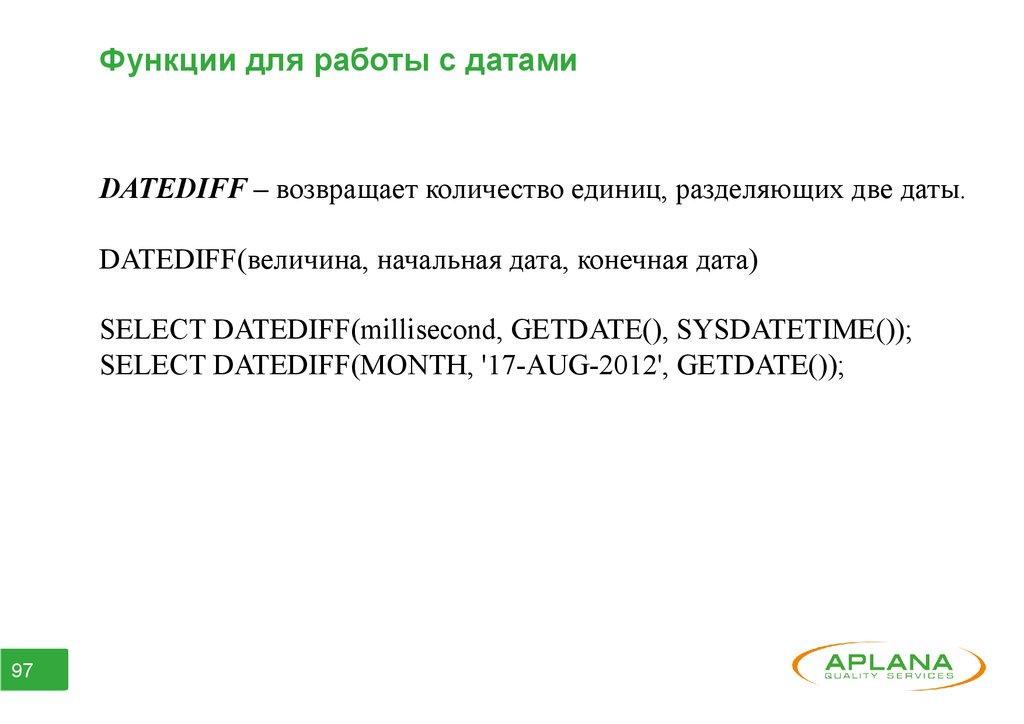Функции для работы с датамиDATEDIFF – возвращает количество единиц, разделяющих две даты.