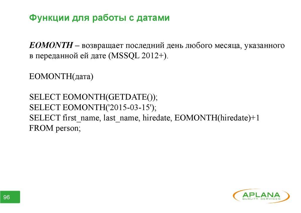 Функции для работы с датамиEOMONTH – возвращает последний день любого месяца, указанного