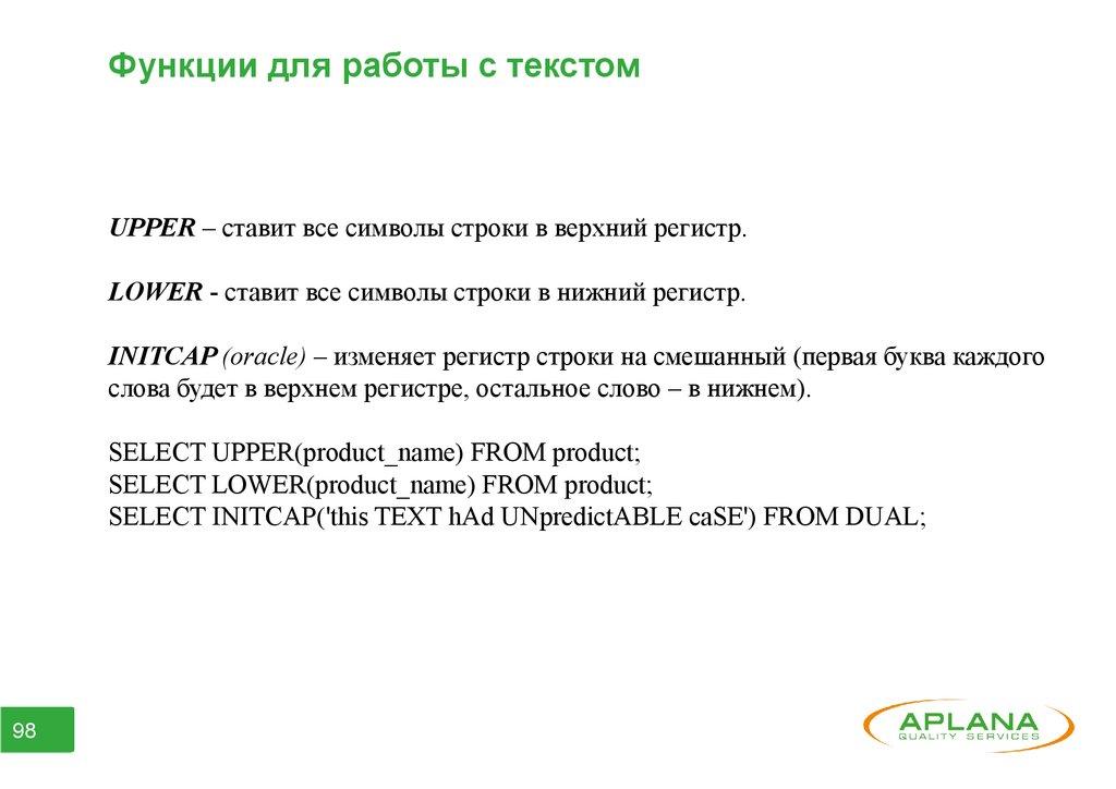 Функции для работы с текстомUPPER – ставит все символы строки в верхний регистр.