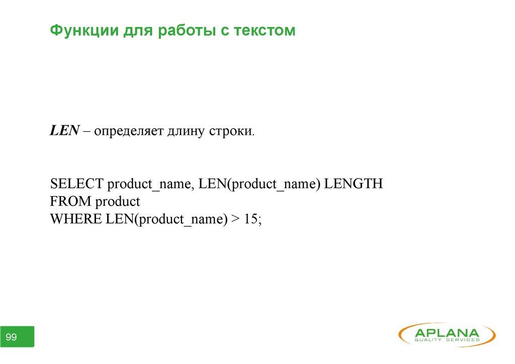 Функции для работы с текстомLEN – определяет длину строки.