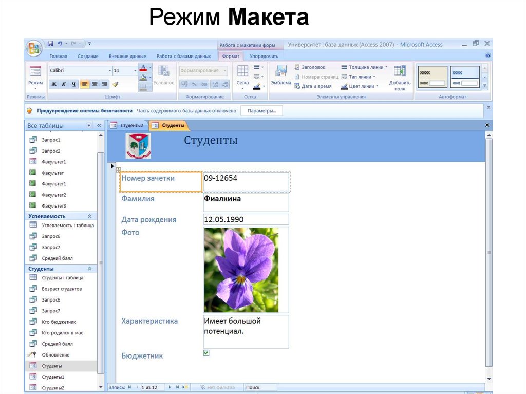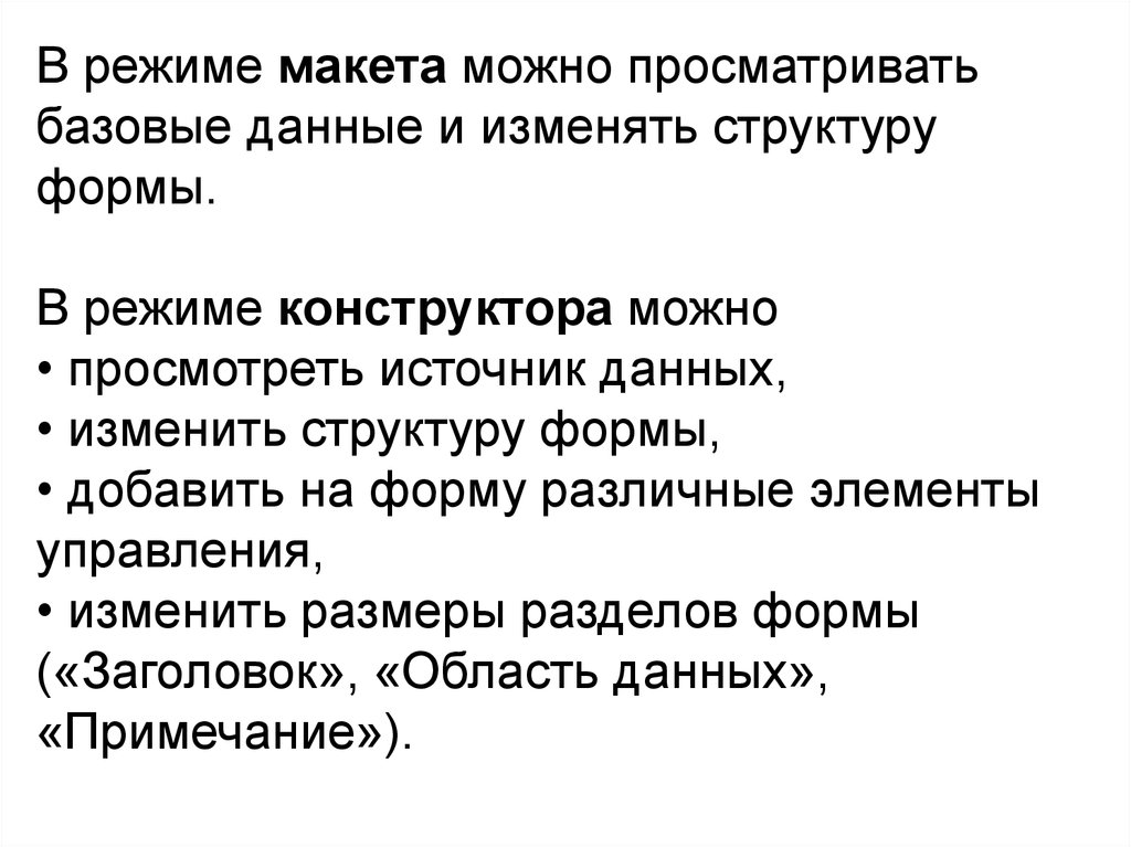 В режиме макета можно просматриватьбазовые данные и изменять структуру