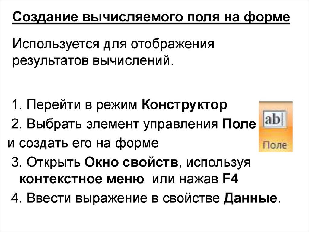 Создание вычисляемого поля на формеИспользуется для отображения