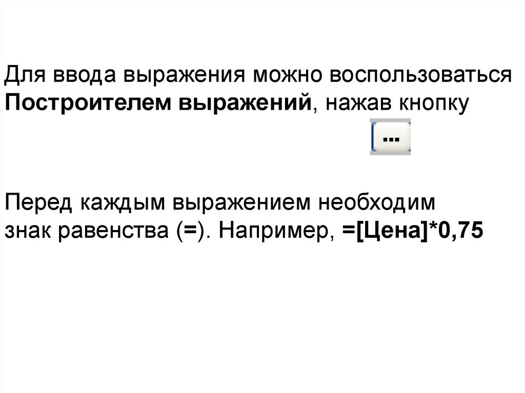 знак равенства (=). Например, =[Цена]*0,75