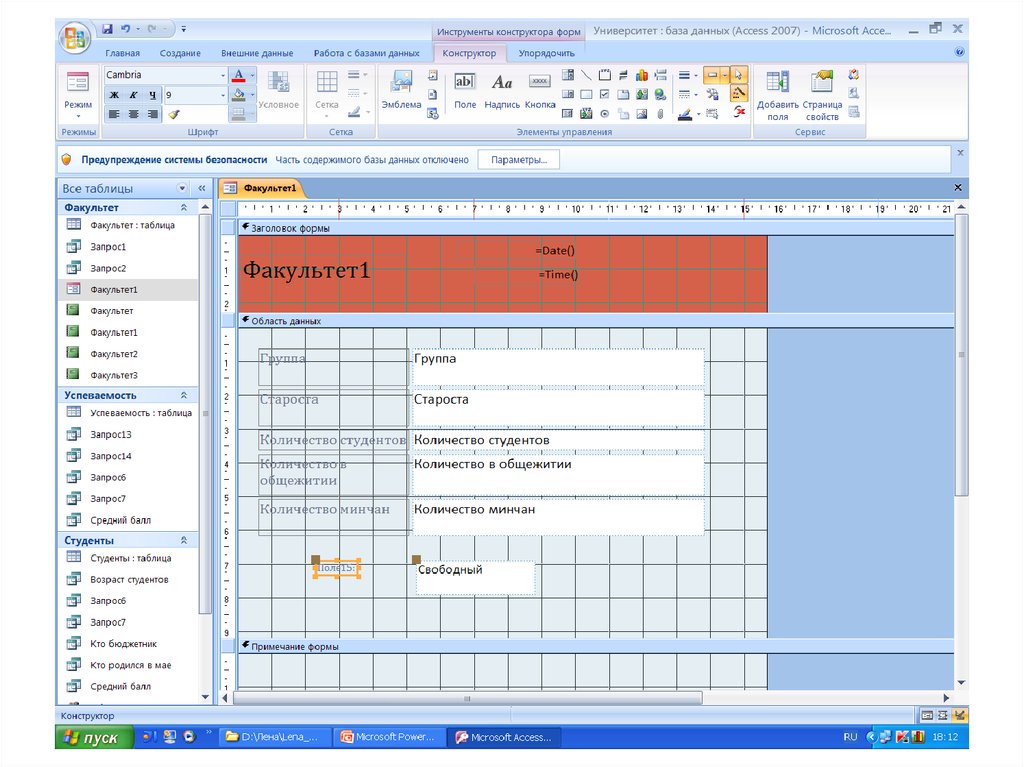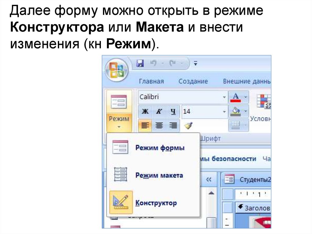 Далее форму можно открыть в режимеКонструктора или Макета и внести
