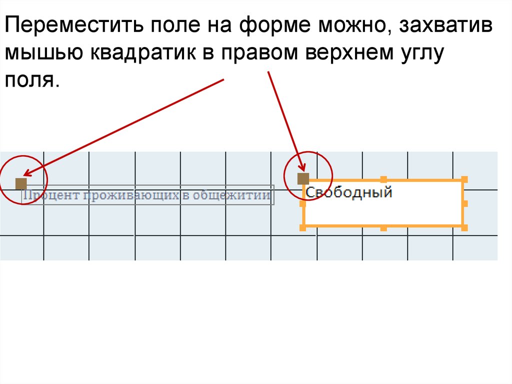 Переместить поле на форме можно, захвативмышью квадратик в правом верхнем углу