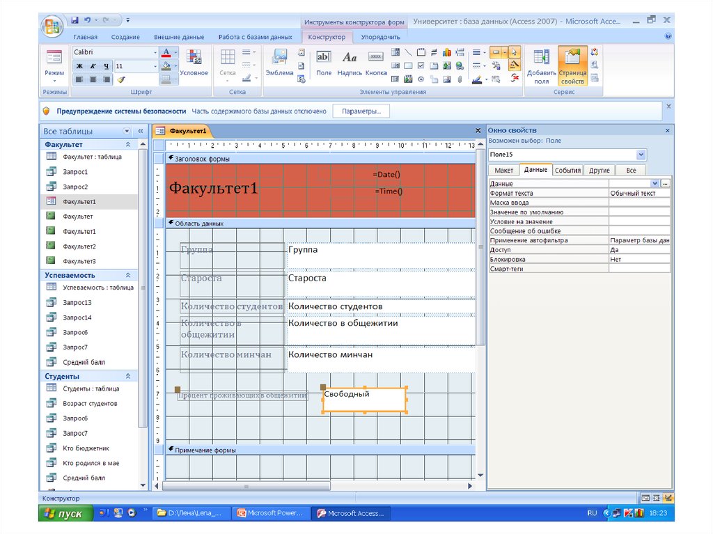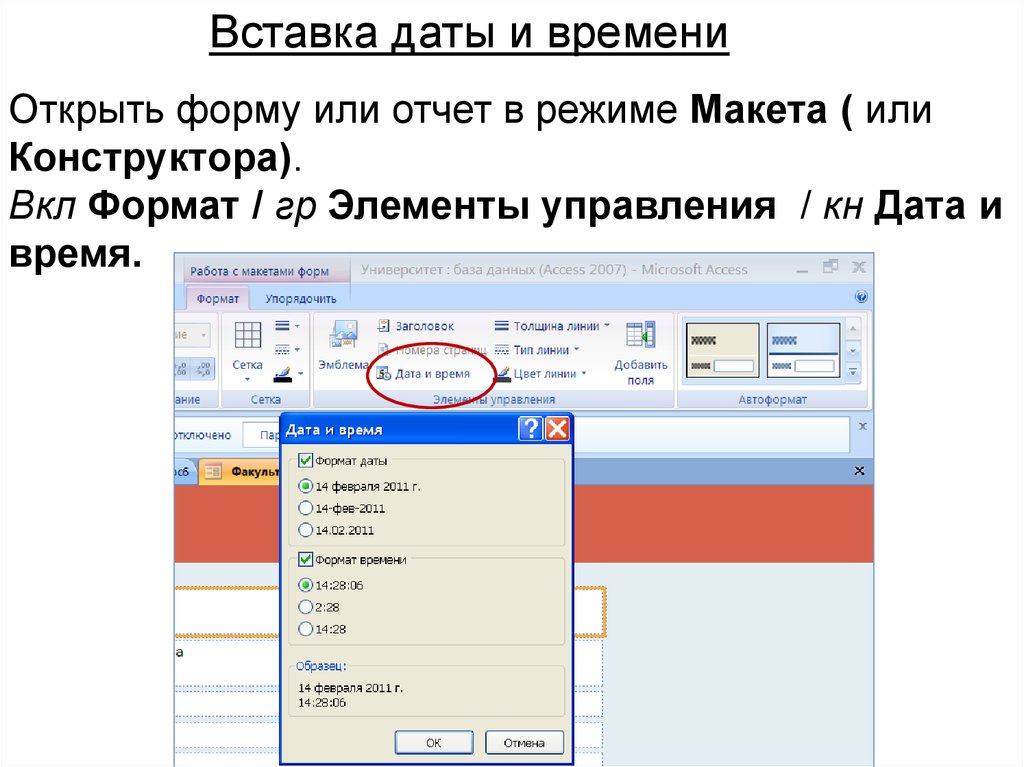 Вставка даты и времениОткрыть форму или отчет в режиме Макета ( или