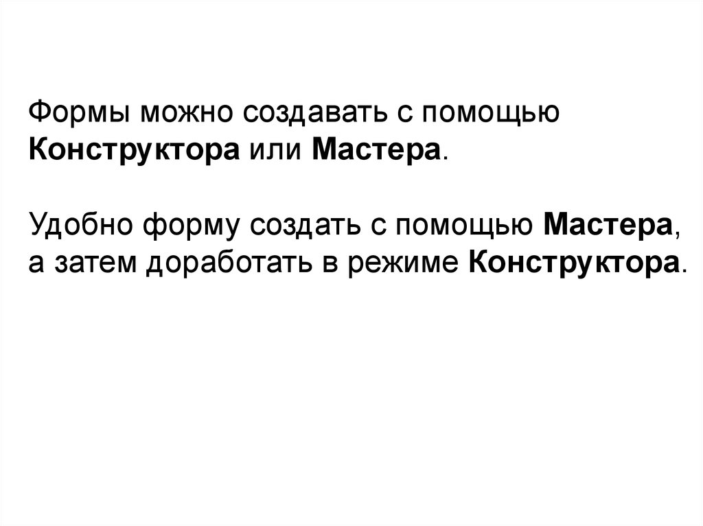Формы можно создавать с помощьюКонструктора или Мастера.