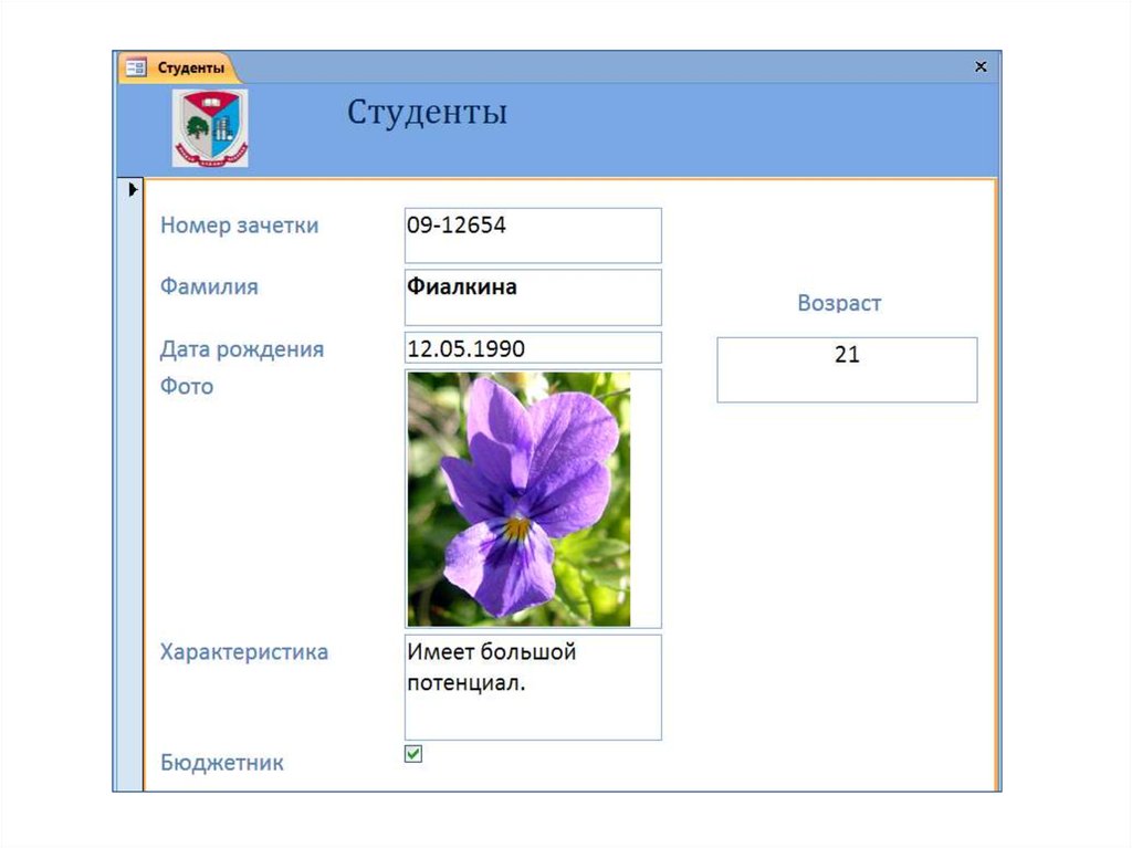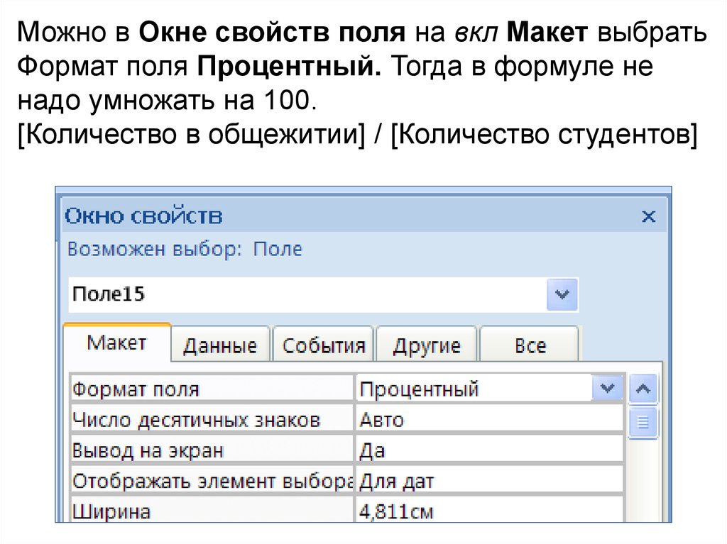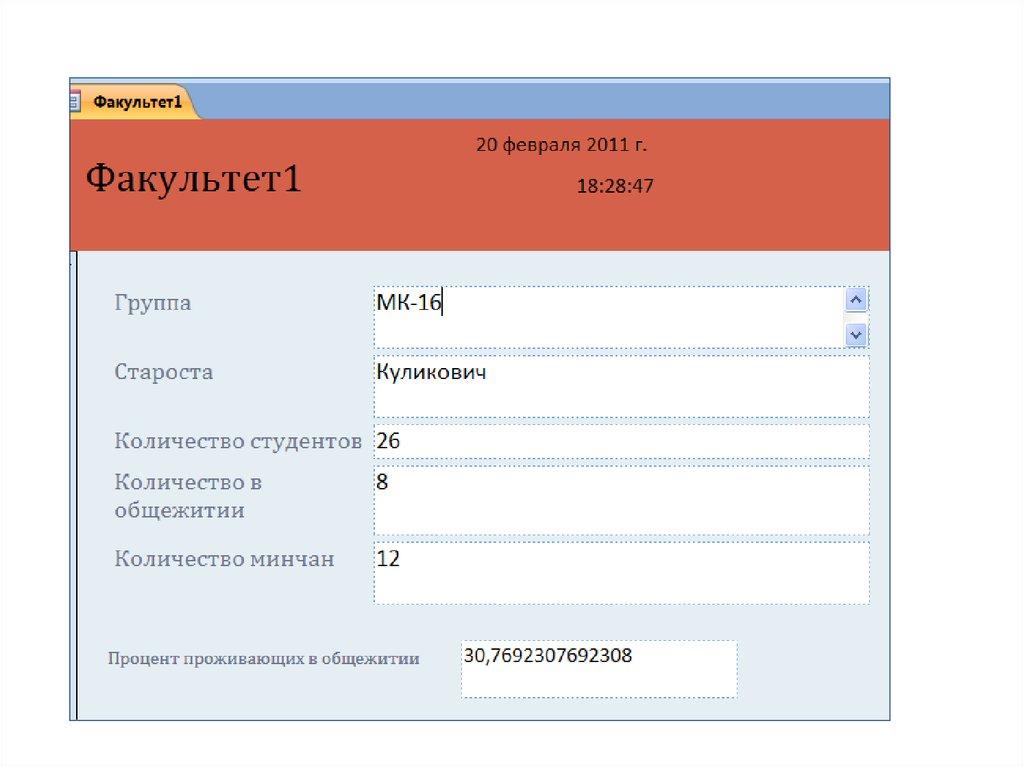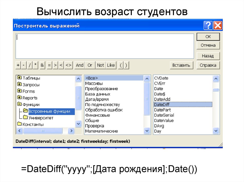 Вычислить возраст студентов=DateDiff("yyyy";[Дата рождения];Date())
