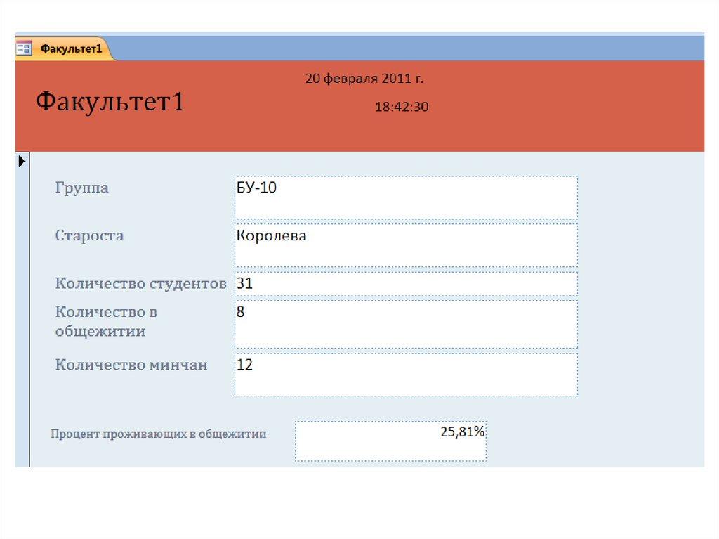 Посчитать, какой процент студентов группыпроживает в общежитии