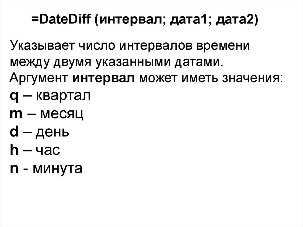 =DateDiff (интервал; дата1; дата2)Указывает число интервалов времени